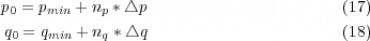 Die vorgegebenen Werte der Randpunkte der obigen Fläche der Mandelbrot Figur werden in die Anzeigefläche wie folgt abgebildet: Die △-Werte sind die Abstände der Messpunkte für die Analyse, ob ein Punkt c in der Mandelbrot-Menge, schwarzer Bereich, liegt oder nicht:
