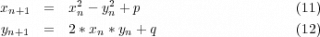 wo gilt (z0 = 0) und (z1 = c) und (z = x + iy</em> und <em>c = p + iq). Daraus folgt dann für (zn+1), aufgeteilt in imaginären und reellen Anteil: